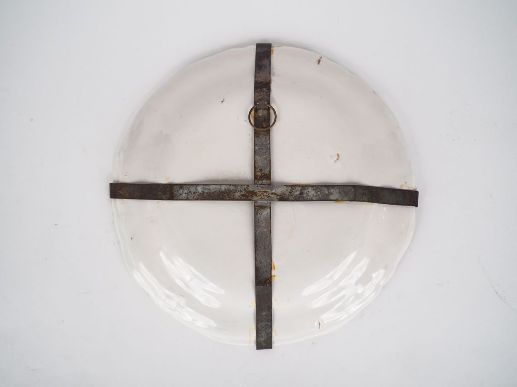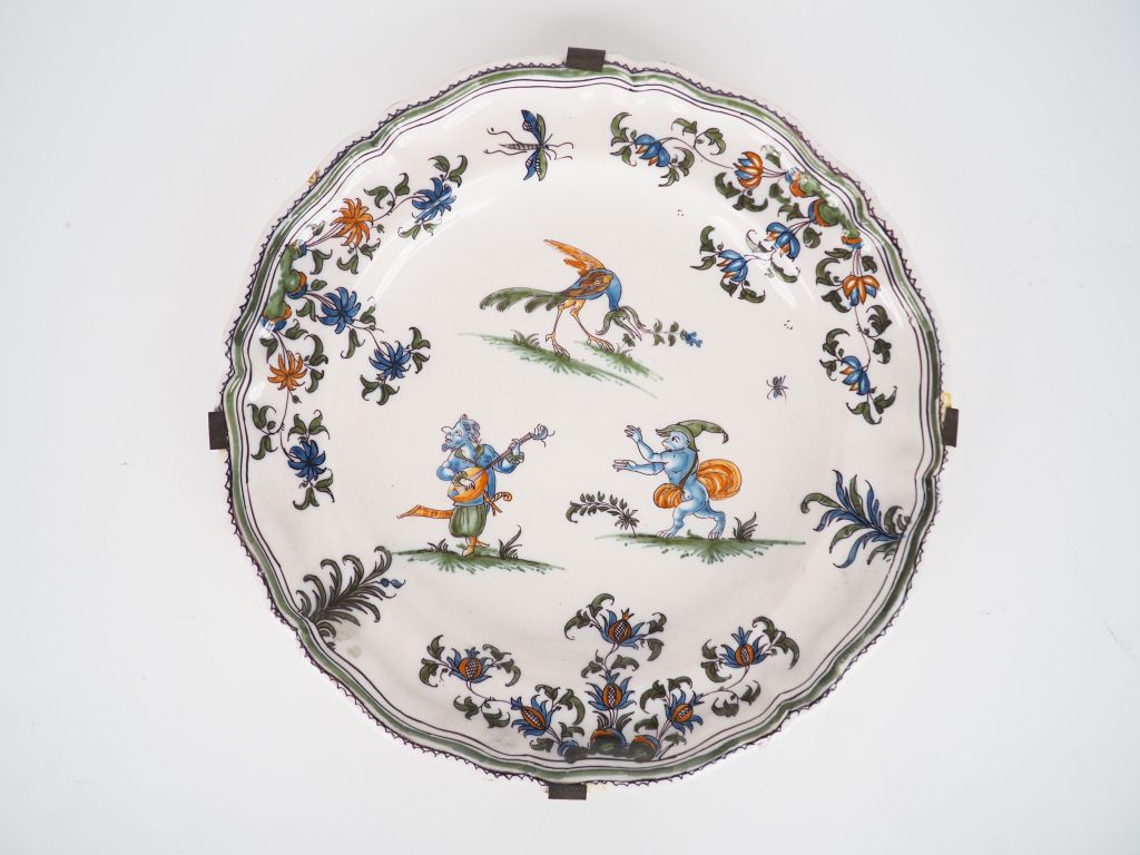 Assiette en faïence de Moustiers XVIIIème, décor polychrome de trois grotesques et de fleurs solanées. Diam : 25 cm.
