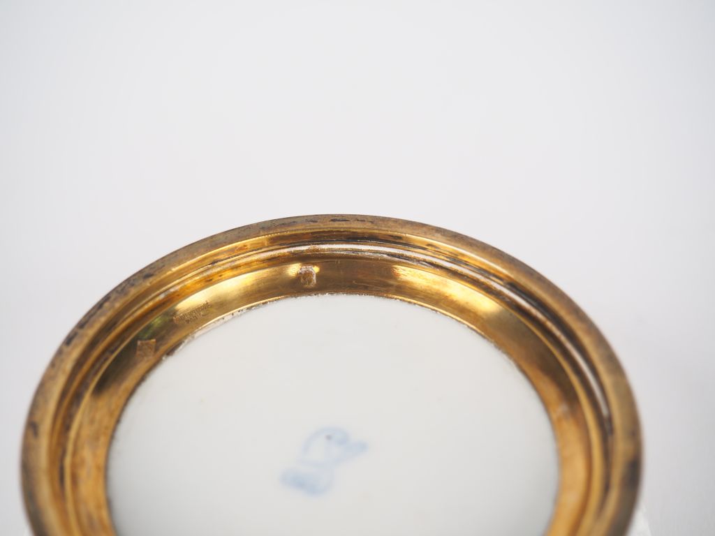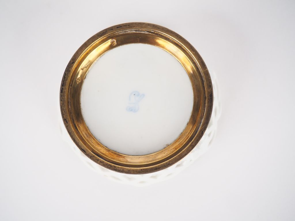 Baguier 1900 en porcelaine allemande en forme de corbeille ajourée, monture en argent, signée RISLTER et CARRE à Paris. Dim. 8 x 4 cm.