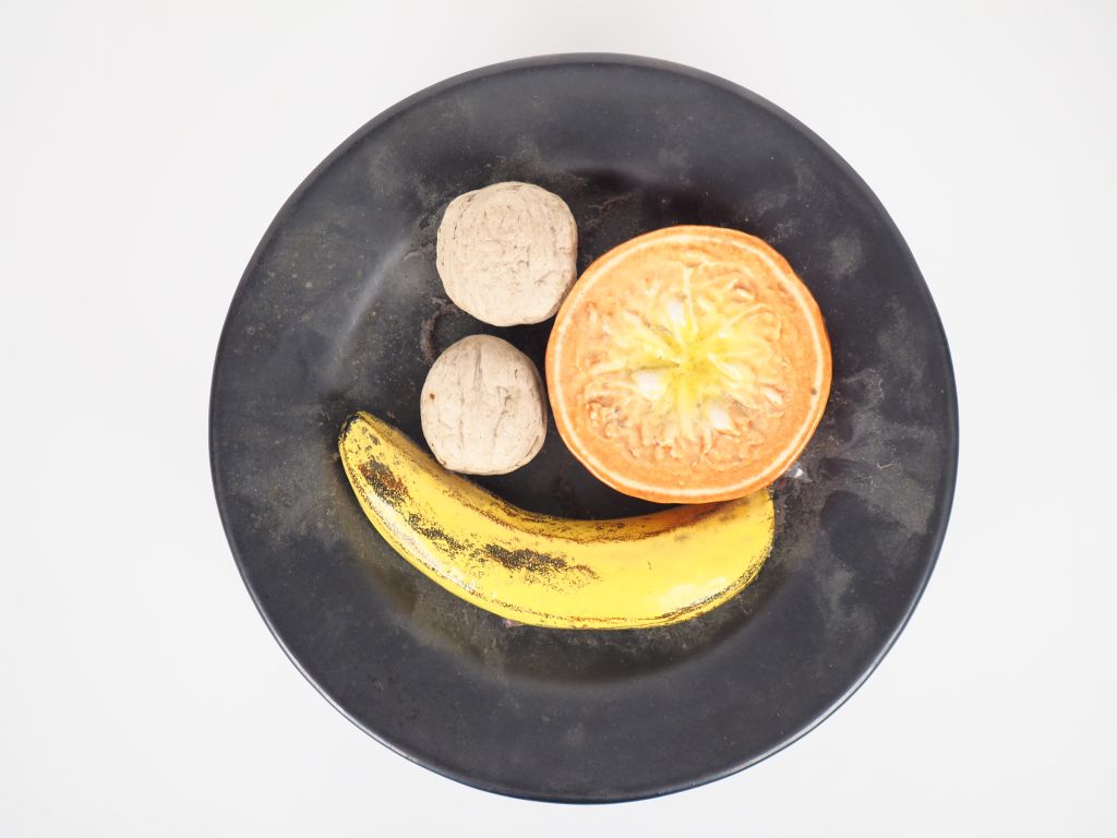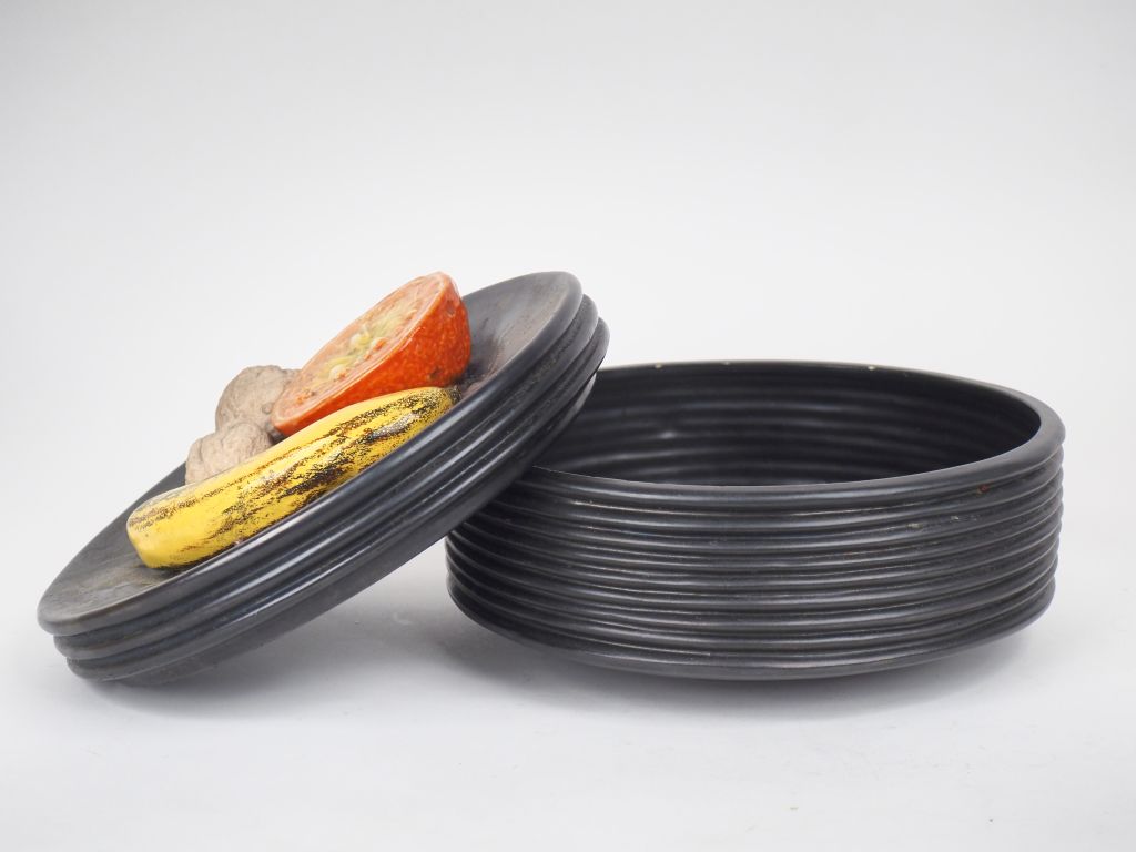 Boîte couverte en céramique Xxème à décor en relief de fruits en trompe-l'œil. Dim. 11 x 22,5 cm. (Petites égrenures à l'interieur).