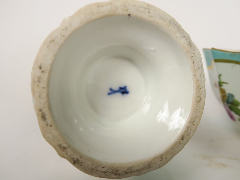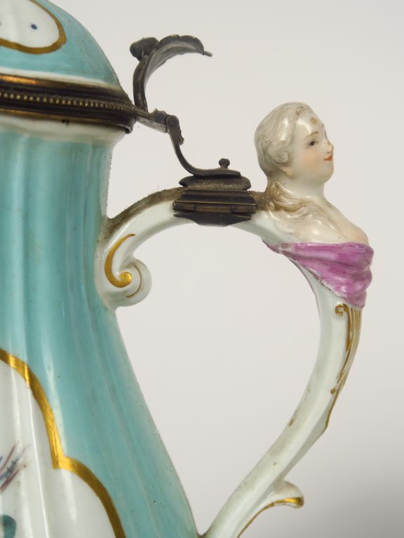 Broc et son bassin début XIXème en porcelaine polychrome de Saxe, à décor dans des réserves de fleurs polychromes sur fond céladon, anse en ronde en forme de jeune fille. Monture en argent. H. du broc : 25 cm H. du bassin : 10 cm Diam. 24 cm