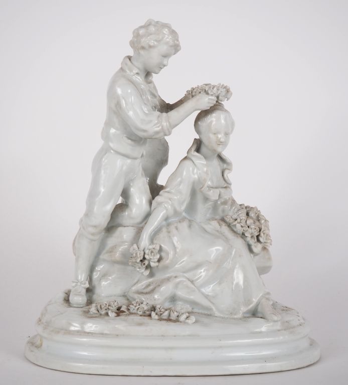 CAPODIMONTE. Groupe en porcelaine blanche figurant un scène galante. H. 33 cm (petite égrenure)