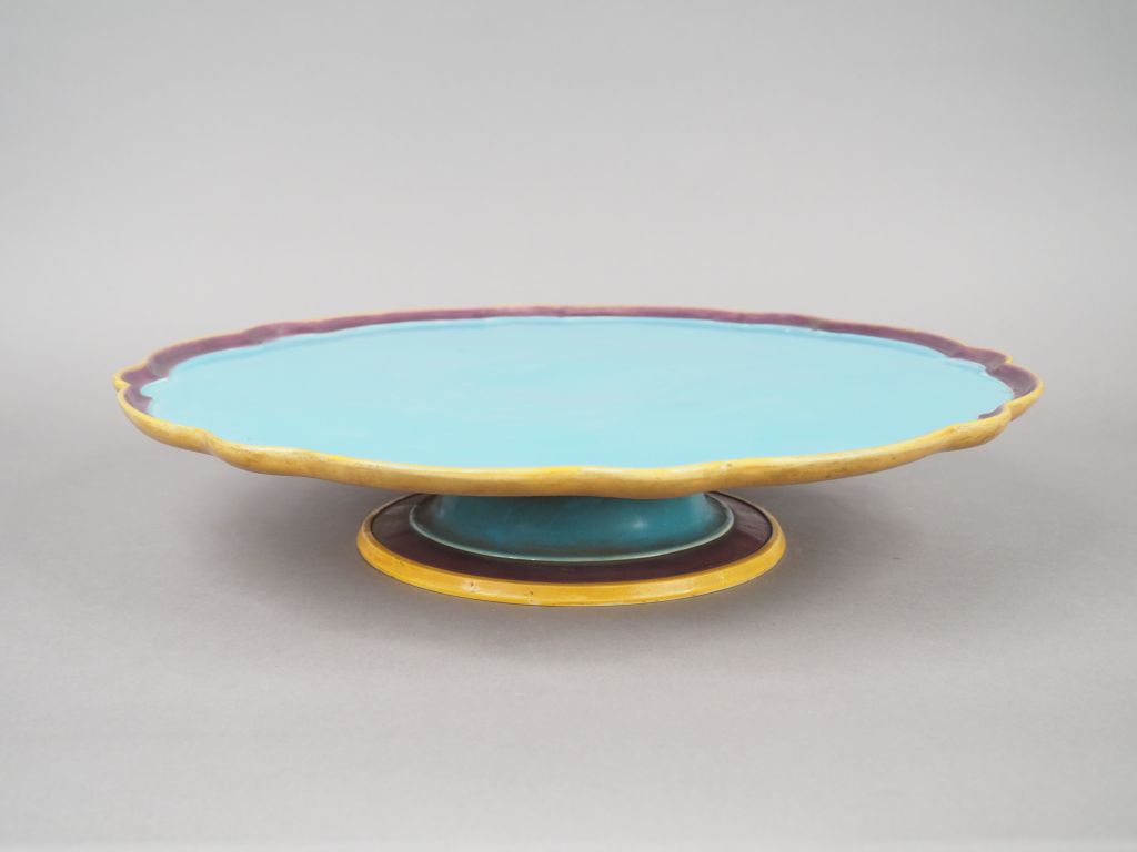 Centre de table Napoléon III en céramique de Minton, de couleur moutarde, parme et bleu ciel, bord polylobé, plateau tournant. H. 10 cm Diam. 46,5 cm