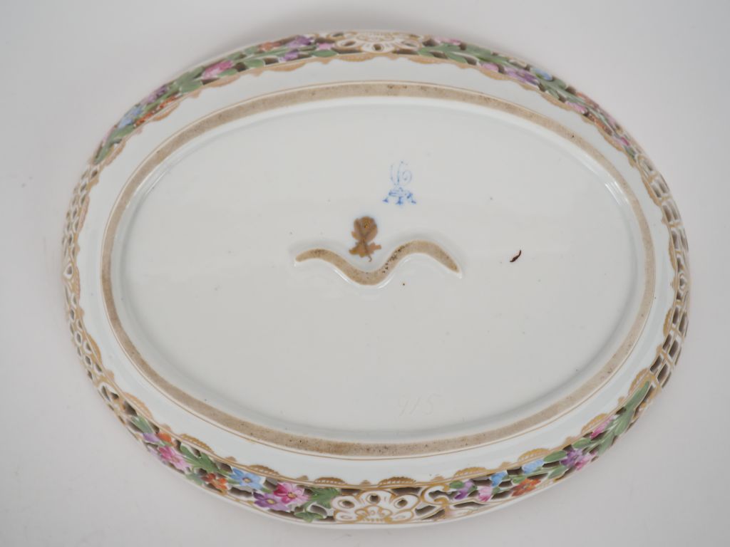 Coupe creuse 1900 en porcelaine de Saxe à décor de fleurs polychromes, bords ajourés Signée Dim. 23 x 18,5 cm