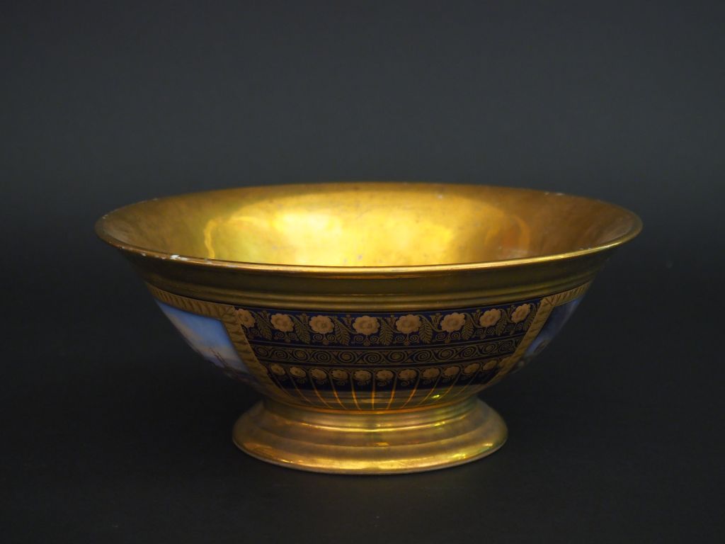 Coupe sur talon en porcelaine de style Empire, à décor dans des réserves de marines sur fond bleu nuit et doré. H. 10 cm. Diam. 22 cm. (égrenure)