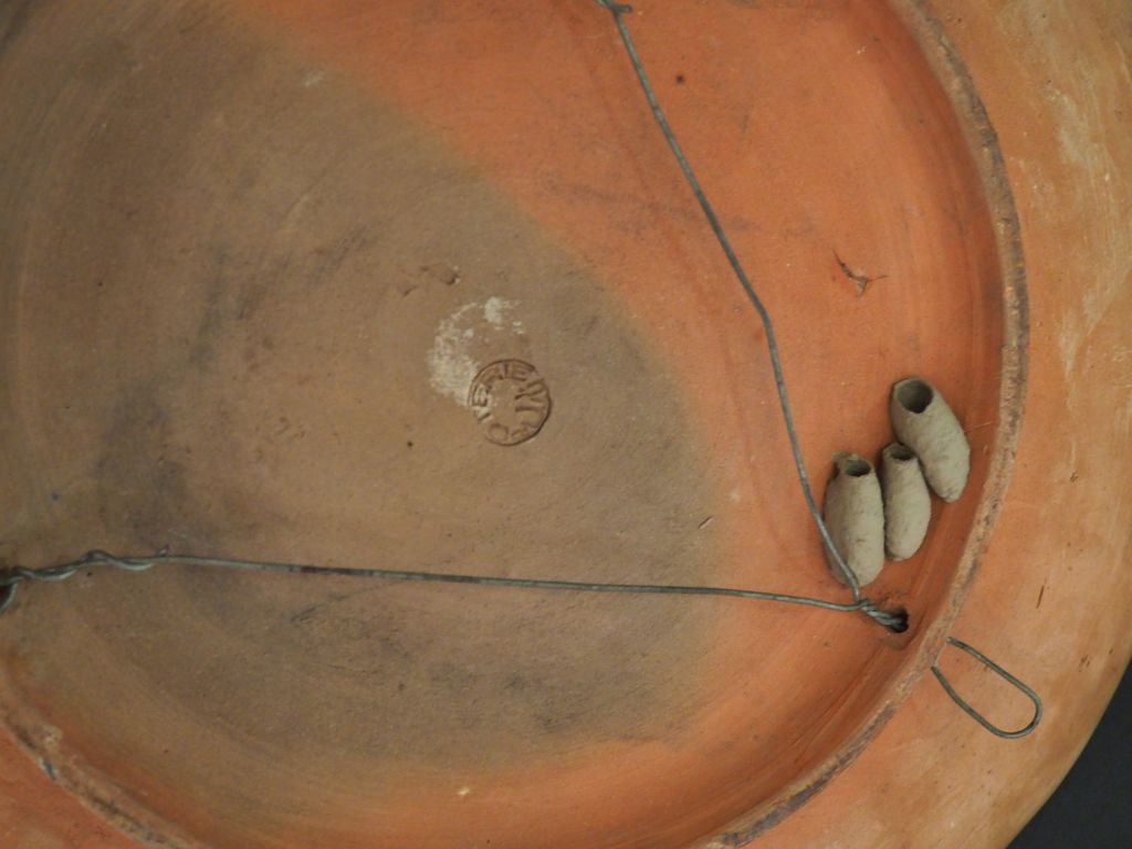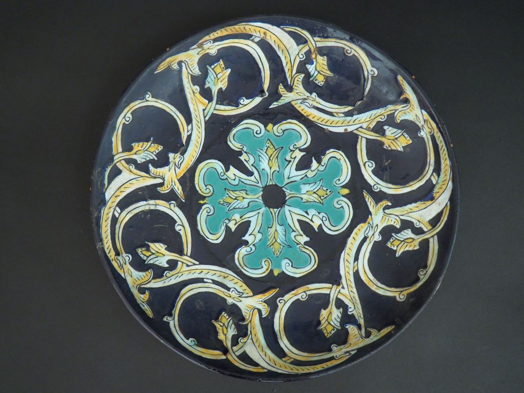 Coupe sur talon en terre vernissée et émaillée à décor de rinceaux vert et jaune sur fond bleu.