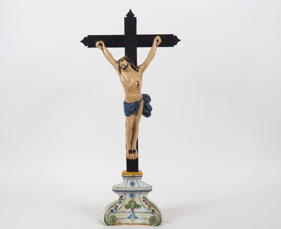 Crucifix en faience polychrome XIXème, socle à décor de fleurs et de feuillage (restauré, Christ en bon état) H. 65 cm