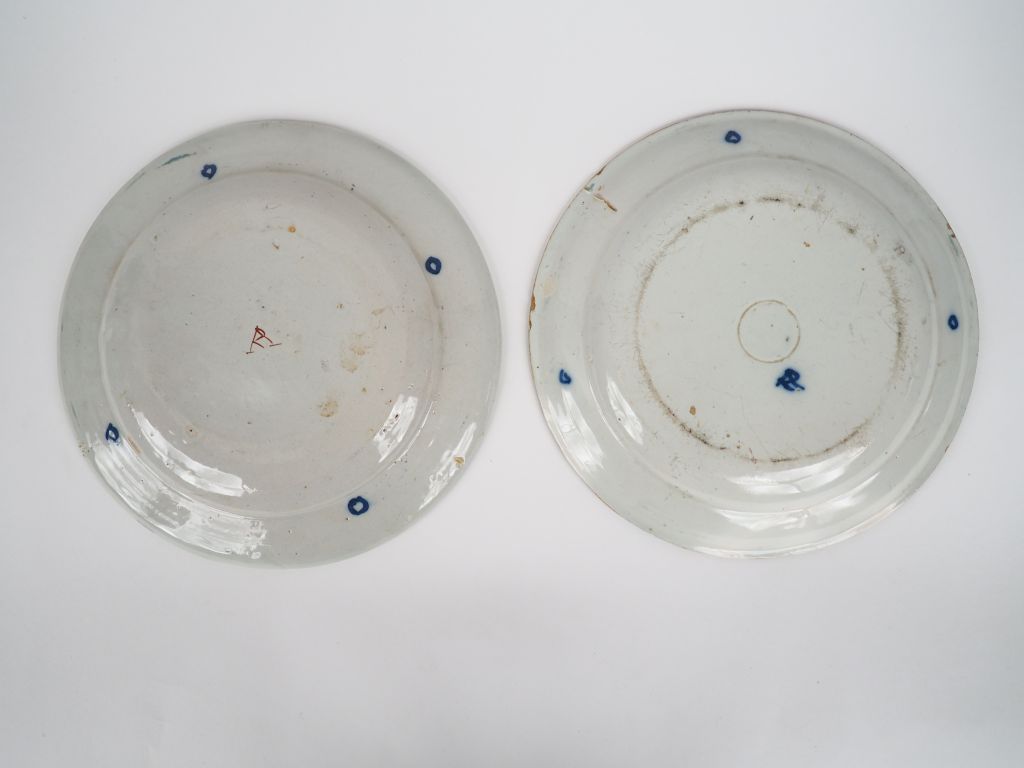 DELFT. Paire d'assiettes en faience XIXème à décor polychrome de quatre cœurs fleuris sur fond vert . Signées Diam. 23.5 cm