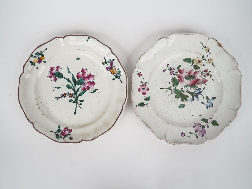 Deux différentes assiettes XVIIIème en faience de l'Est à décor floral. Diam. 23.5 cm