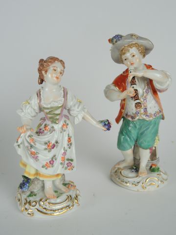 Deux différentes statuettes 1900 en porcelaine polychrome de Saxe ‘jeune vendangeuse’. H. 12 cm ‘le joueur de flageolet’. H. 14.5 cm