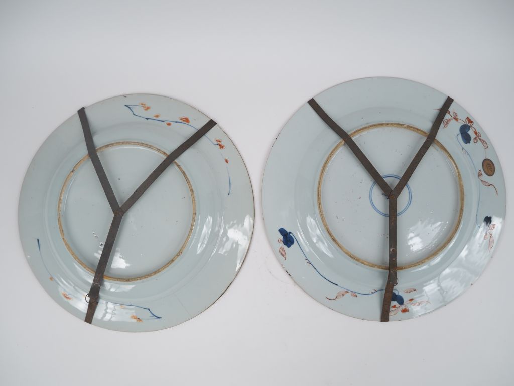 Deux plats XIXème en porcelaine polychrome d'Imari. Diam.38,5 et 39 cm (fel et égrenures)