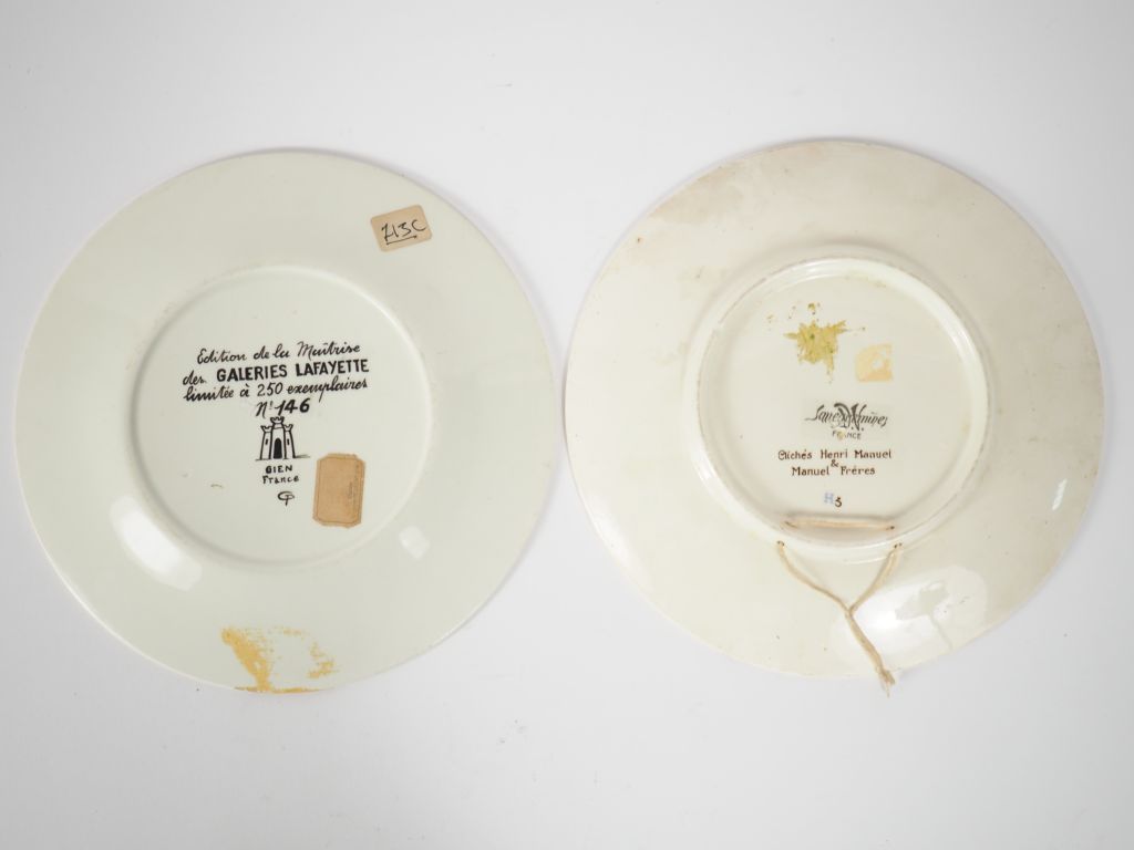 Ensemble de 2 assiettes commémoratives en Gien et Sarreguemines. "Guynemer l'As des As" "Costes et Le Brix 1927 1928 Le Tour du Monde" (petite restauration sur une assiette)