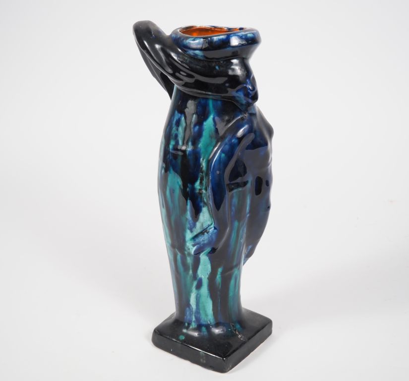 François RE à Vallauris. Carafe en céramique polychrome à décor de jeune fille en léger relief. H. 32 cm.