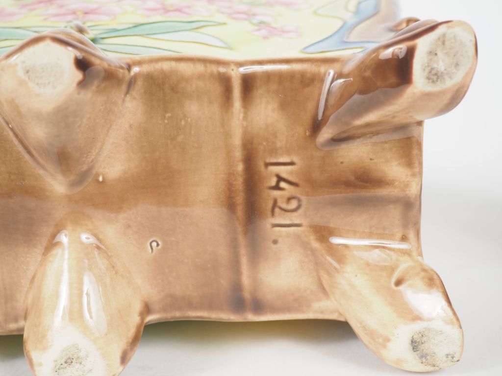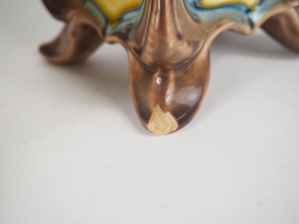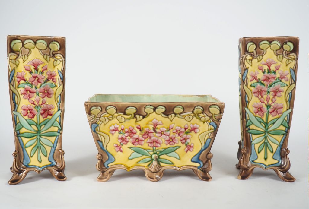 Garniture Art Nouveau en faience à décor de fleurs polychromes comprenant : une jardinière et une paire de vases. (égrenure sur le pied d'un des vases) H. des vases : 31,5 cm Dim. (jardinière) : 39 x 18 cm