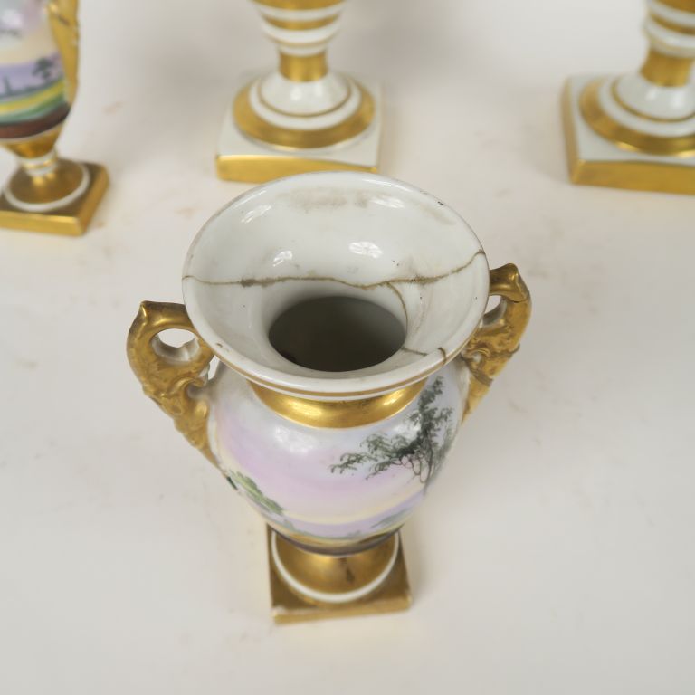 Garniture de cheminée Napoléon III en porcelaine de Paris à décor de paysages, comprenant deux différentes paires de vases. H. 33 cm. H. 17,5 cm. (fel sur un des petits vases)