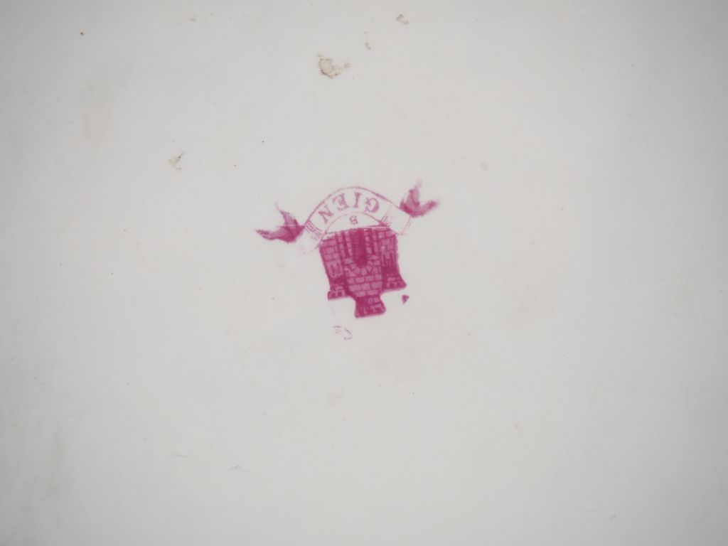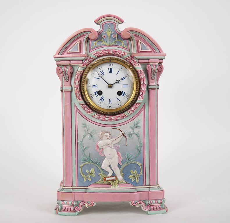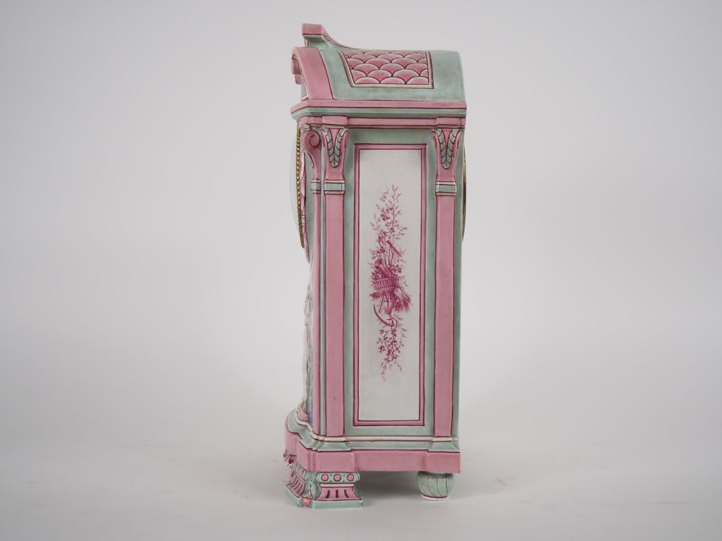 GIEN. Pendule de cheminée en faience polychrome à décor en léger relief d'amour, sur fond rose et bleu canard. Signé avec son balancier H. . 39 cm