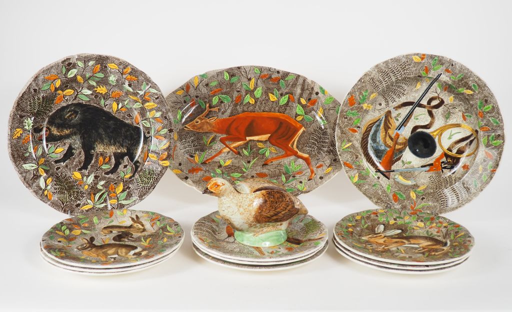 GIEN. Service de table en faïence modèle "Rambouillet" comprenant : 3 plats, 13 assiettes et une saucière en forme de caille. Différentes dates de fabrication. (égrenure sur la saucière).
