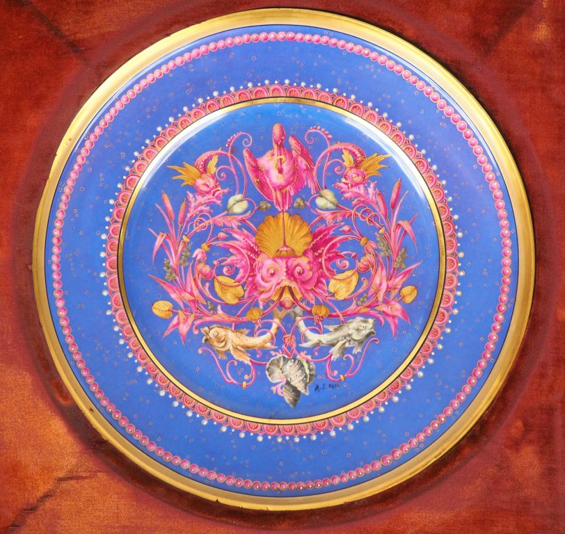 Grand plat circulaire en porcelaine polychrome de Limoges à décor de faune et de flore marine. Monogrammé AC ou AG Diam. 33 cm (encadré)