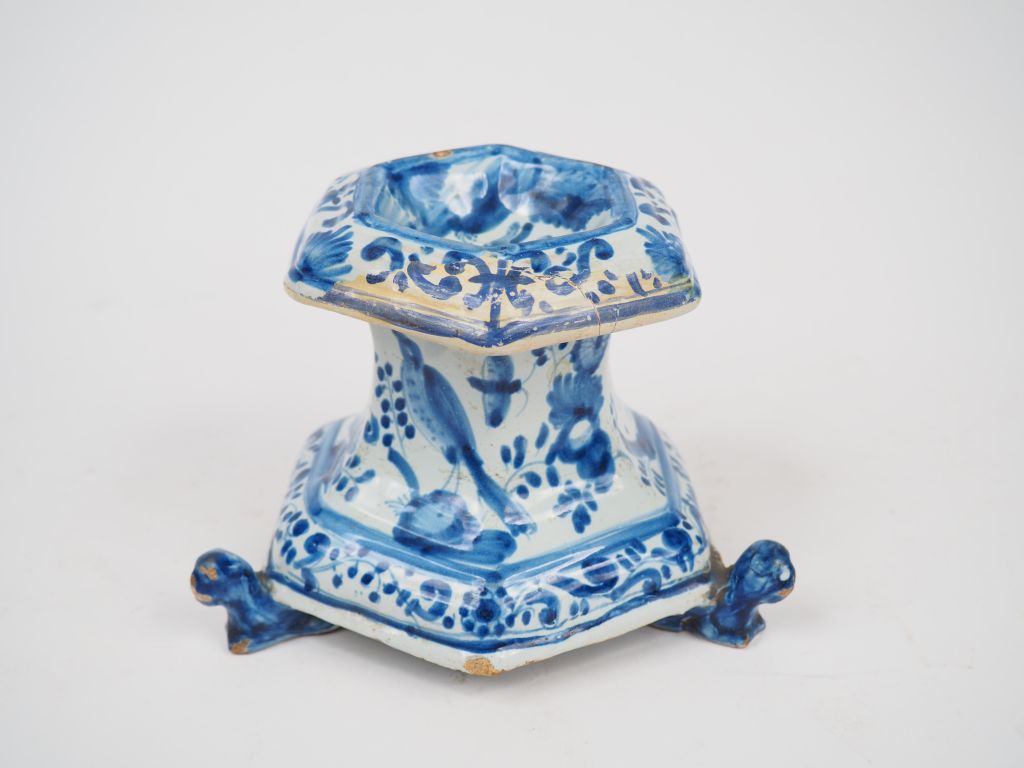 Grand saleron XVIIème en faïence, à décor en camaïeu bleu d’oiseaux et de lapin. H. 11 cm (accidents et restaurations)