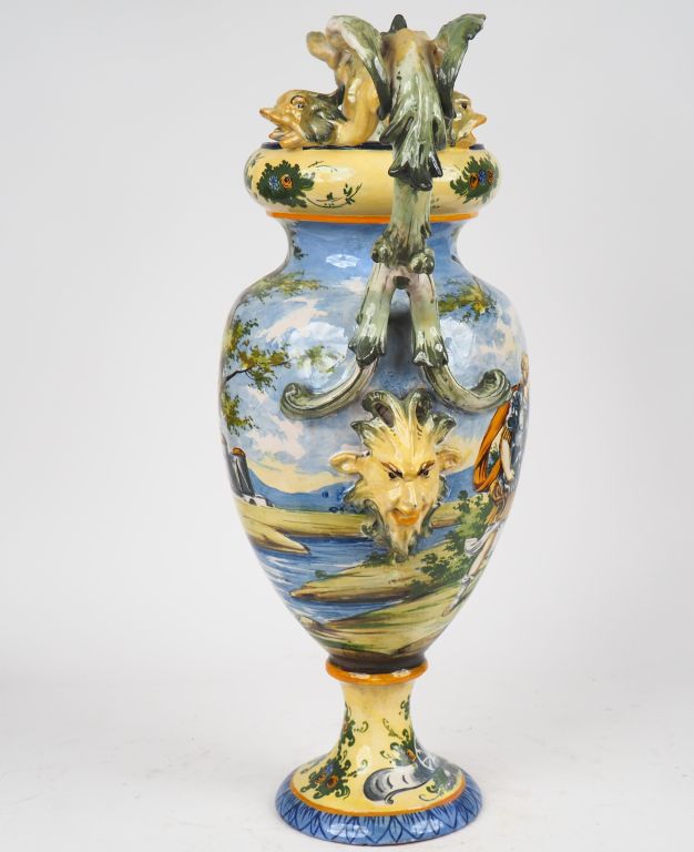 Grand vase fin XIXème début XXème en majolique italienne à décor de paysage animé, anses ajourées à décor de chimères et de masques. H. 64,5 cm.