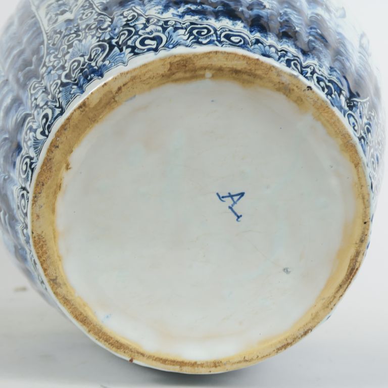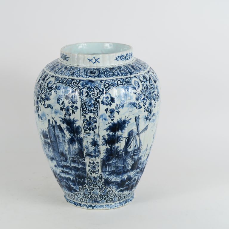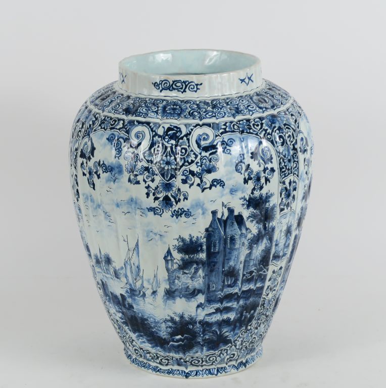 Grand vase XIXème en faience de Delft à décor en camaïeu bleu dans des réserves de marine et de scène bucolique. Signé H. 44 cm