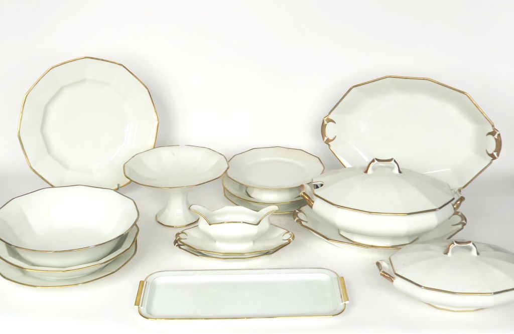 Importante partie de service de table en porcelaine de Limoges blanche et dorée, de style Art Déco.