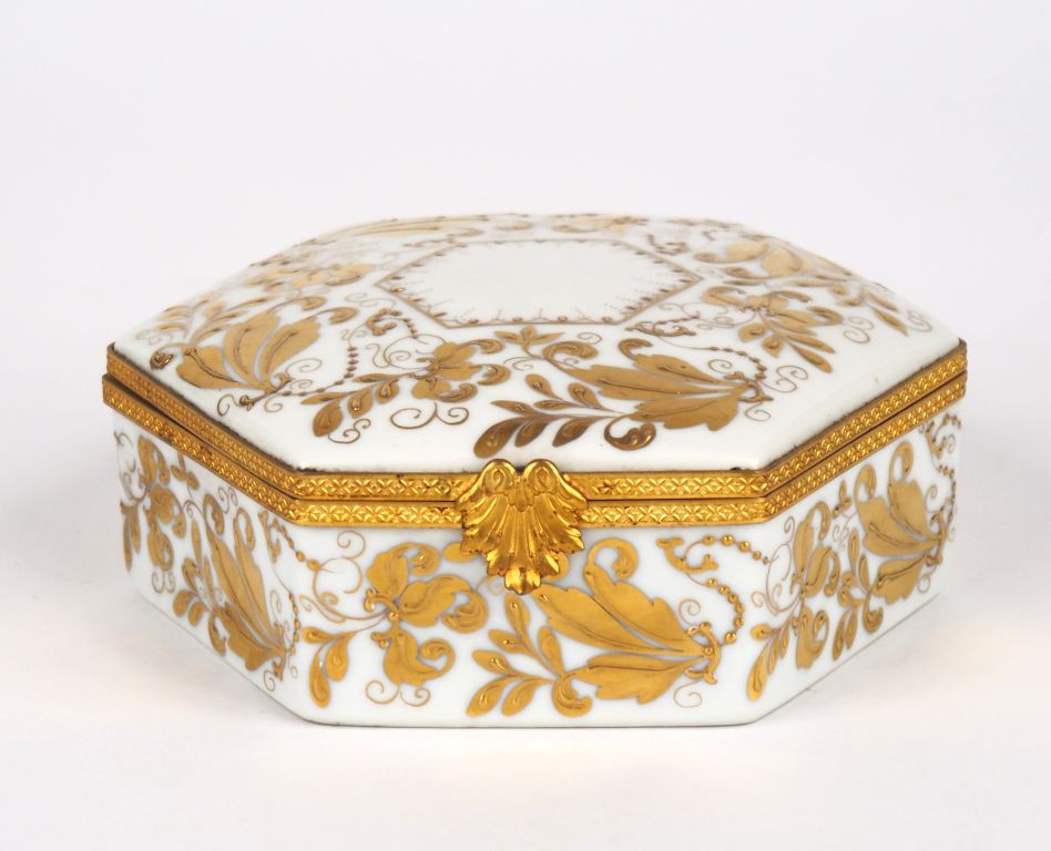 LE TALLEC à Paris. Boîte couverte en porcelaine à décor émaillé et doré de rinceaux feuillagés. Signée. Dim. 5 x 14,5 x 13 cm.