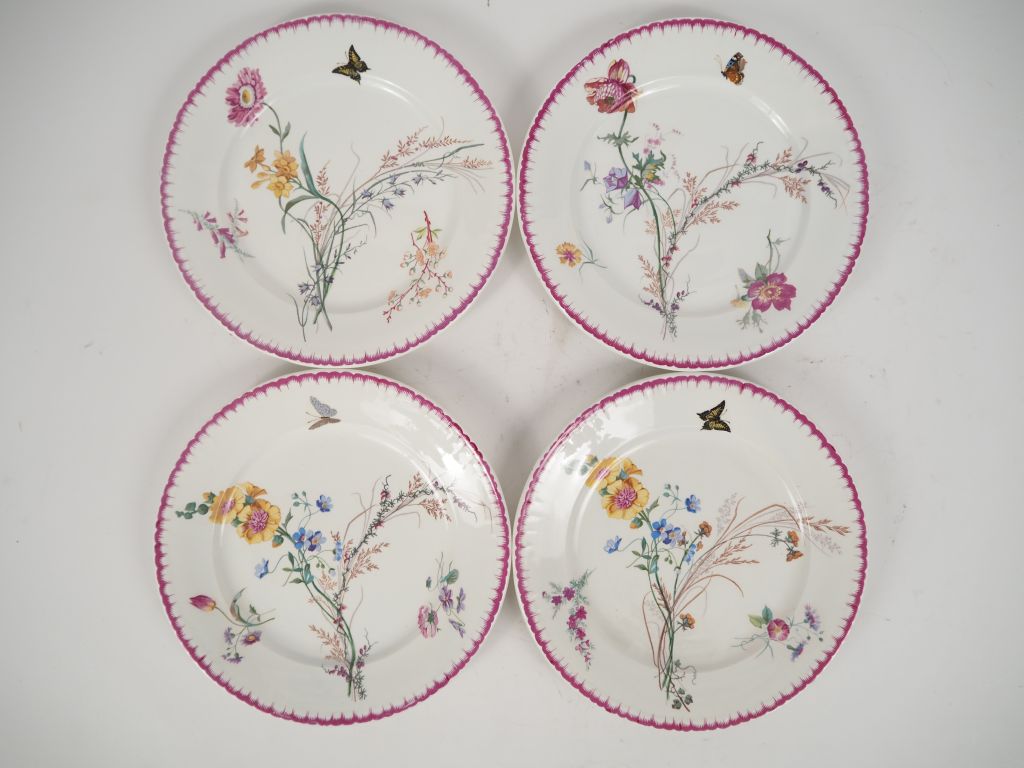 Manufacture de VIEILLARD à Bordeaux. Partie de service de table en faïence à décor polychrome de fleurs et et de papillons. Comprenant 8 assiettes creuses et 12 assiettes plates.