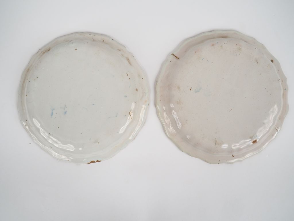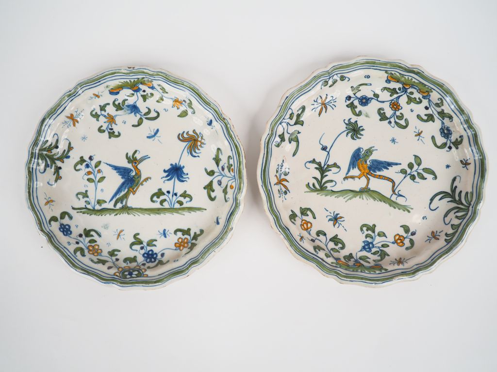 Paire d'assiettes en faience fin XVIIIème début XIXème à décor polychrome de grotesque.