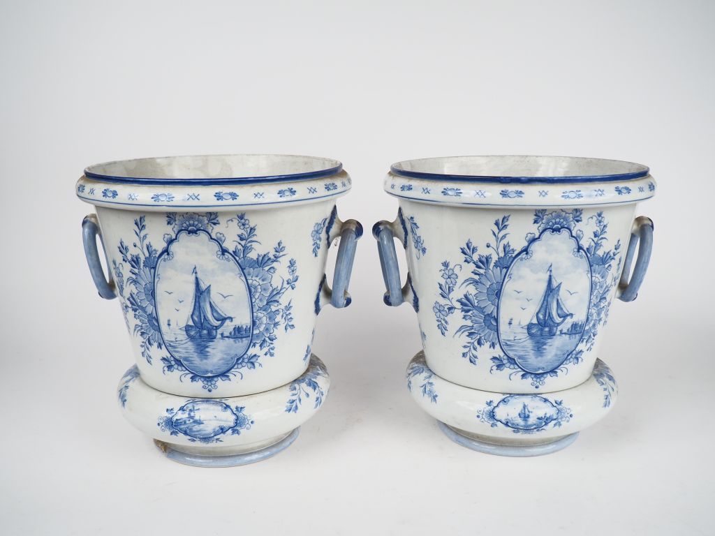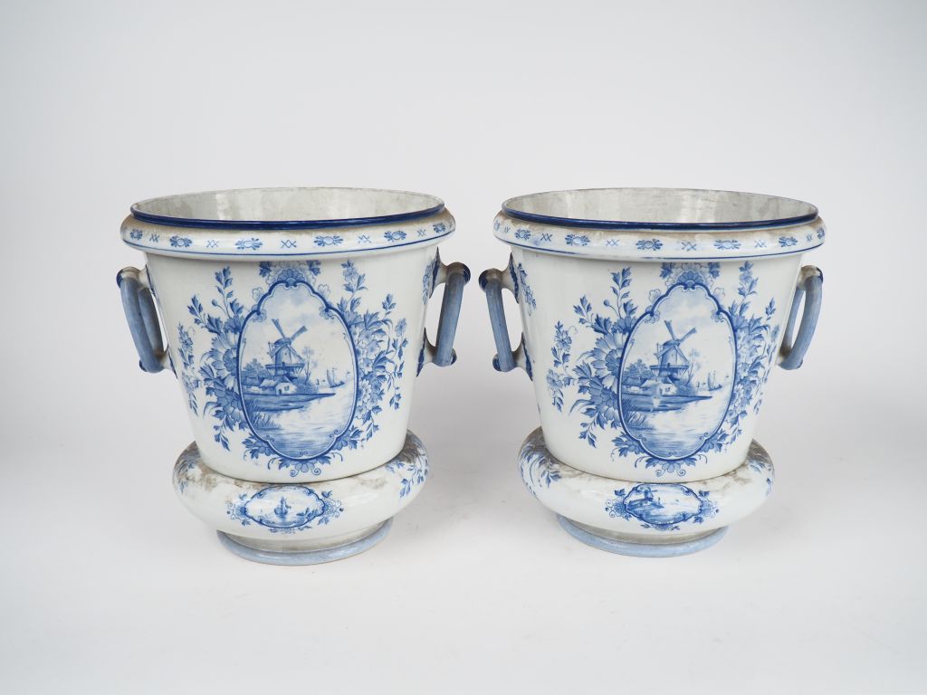 Paire de caches pots en faïence de Delft à décor de paysages hollandais dans des réserves et de guirlandes de fleurs. H. 32 cm.