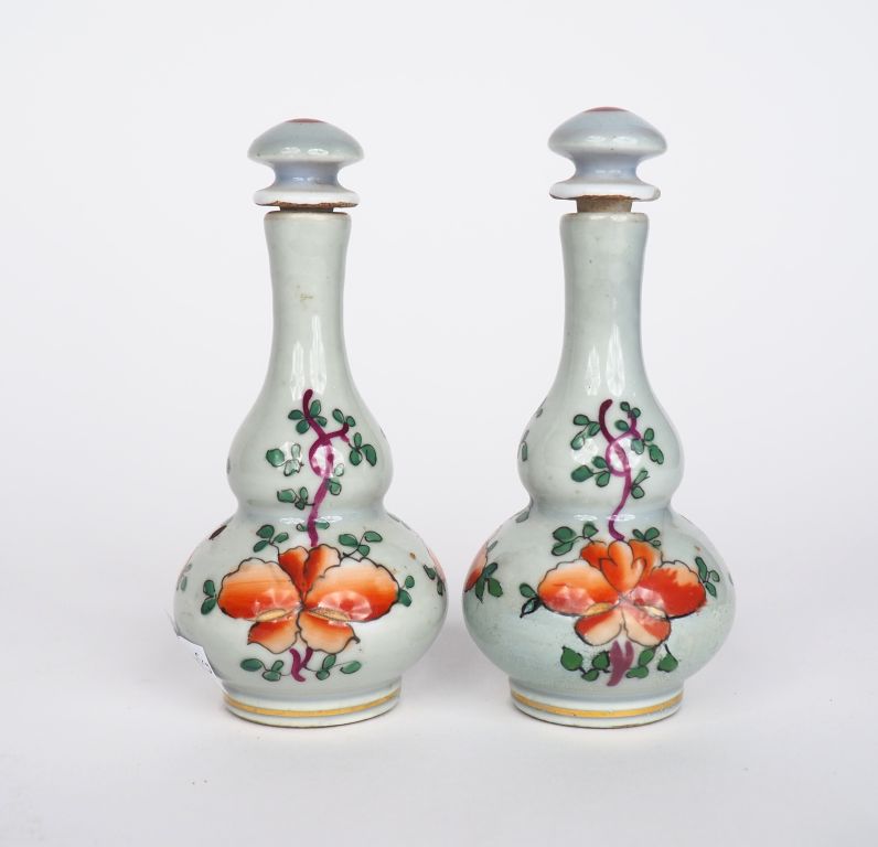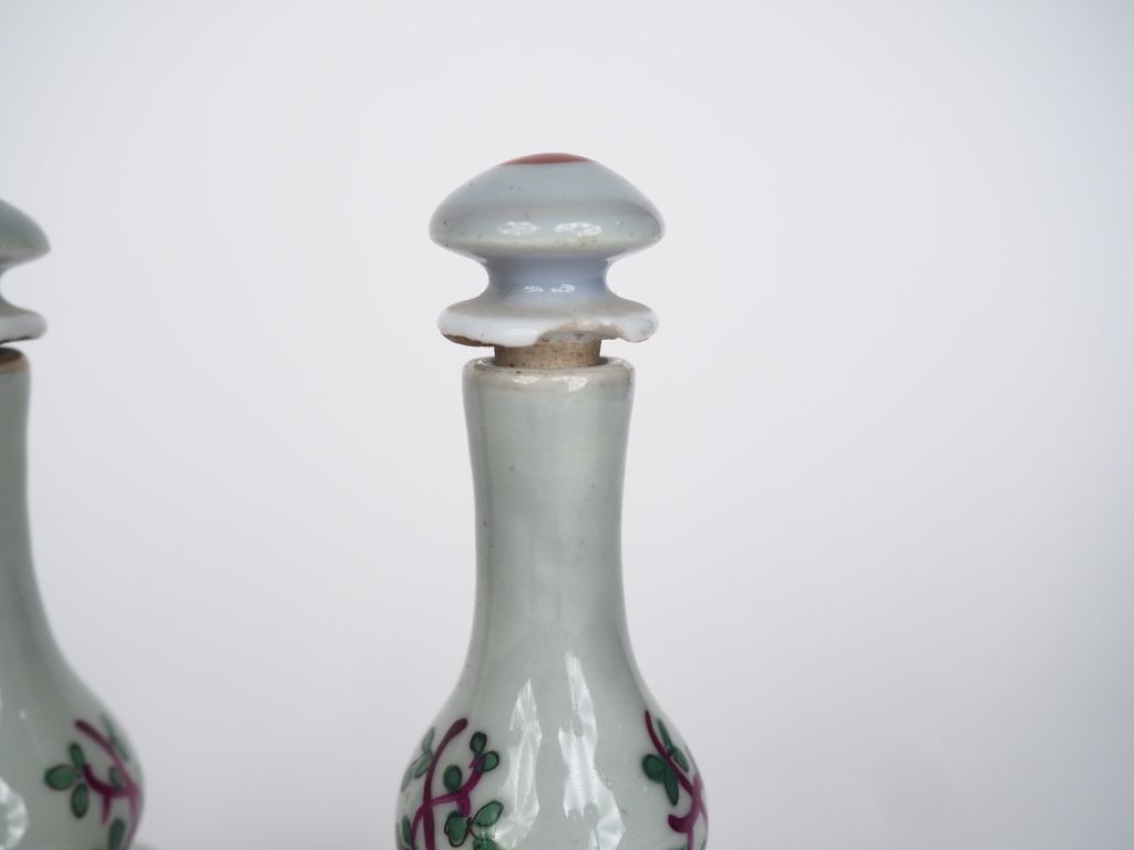 Paire de flacons de parfum XIXème en porcelaine polychrome de Bayeux à décor de fleurs sur fond céladon. H. 11,5 cm. (égrenures sous l'un des bouchon).