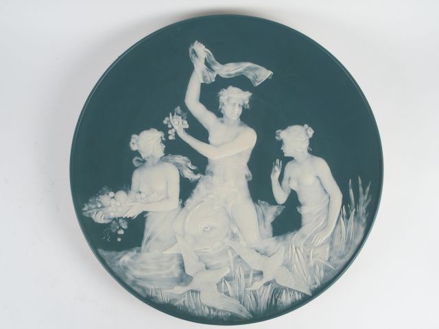 Paire de grands plats Art Nouveau en céramique à décor en léger relief de bachanales sur fond vert. Signés au dos METTLACH GES. GESCH. Diam. 52 cm