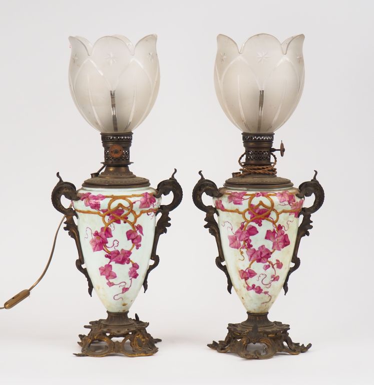 Paire de lampes à pétrole Napoléon III en porcelaine à décor polychrome de lière et de profil de jeune femme, monture en métal, tulipes en cristal. H. 64 cm