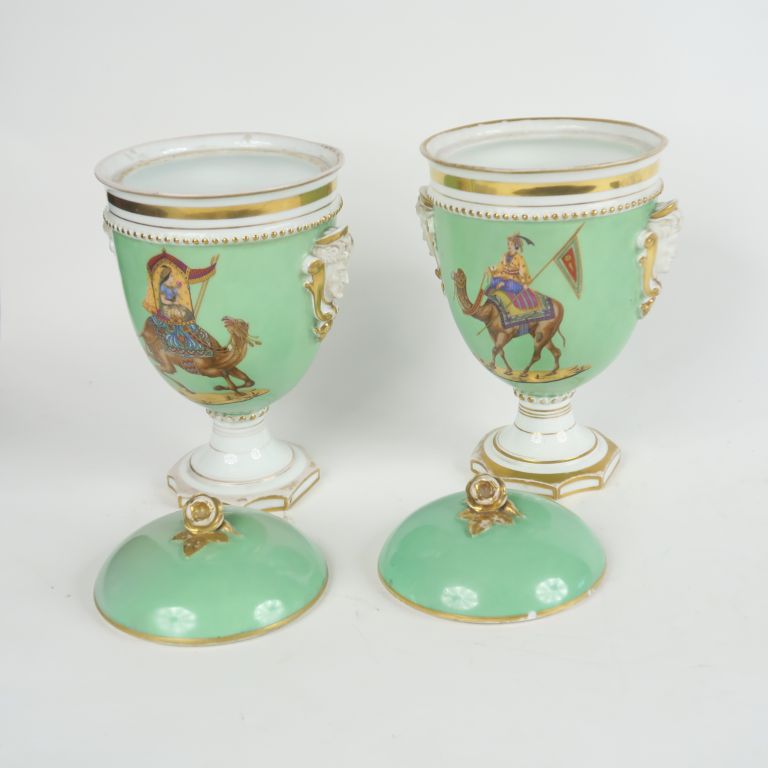 Paire de pots couverts 1900 en porcelaine polychrome, à décor de dignitaires persans sur des chameaux, fond vert et blanc rehaussé d'or, anses en biscuit à décor de tête de personnage (petites égrenures sur un des couvercles) H. 32 cm