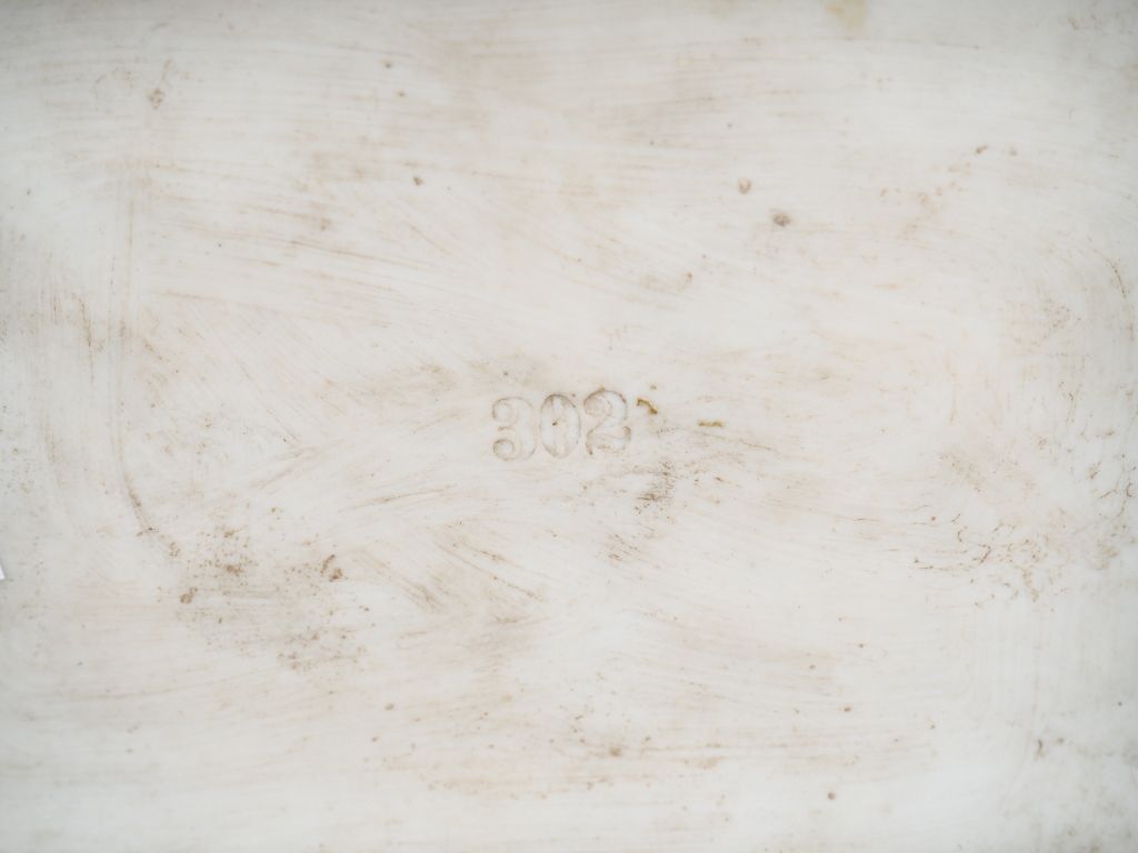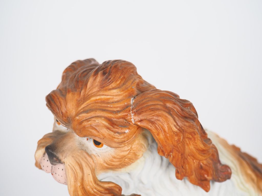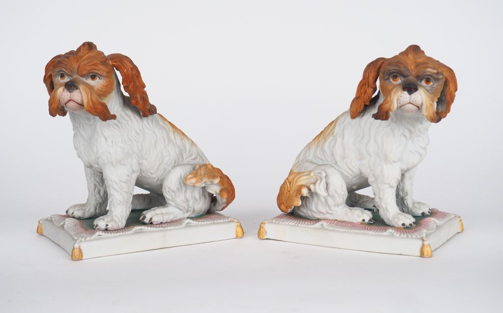 Paire de sujets 1900 en biscuit polychrome "chiens de salon". Numérotés 302. Dim. 17 x 14 x 9,5 cm. (une oreille recollée).