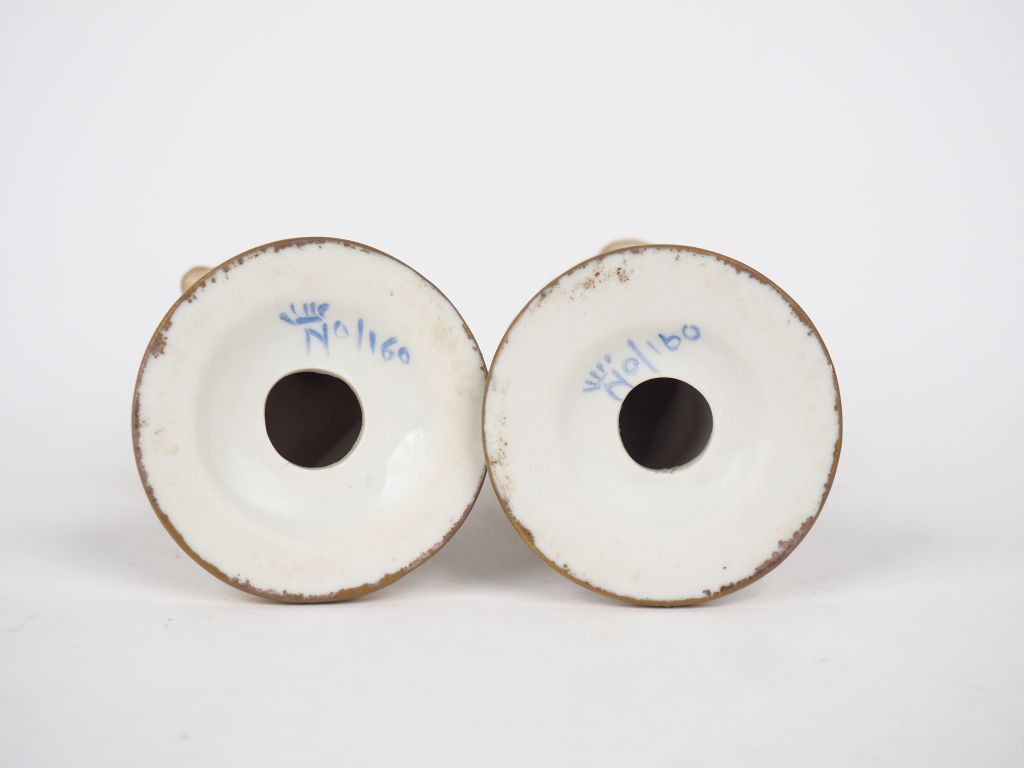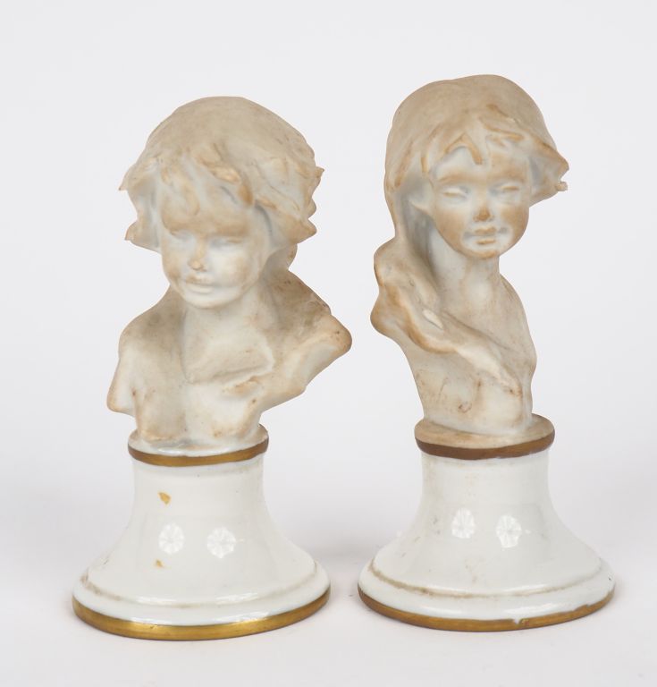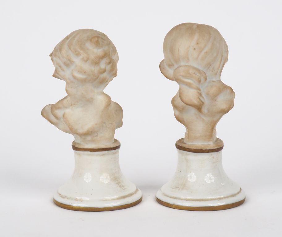 Paire de sujets en biscuit, "bustes d'enfants", sur des socles en porcelaine. Signée. H. 10 cm.
