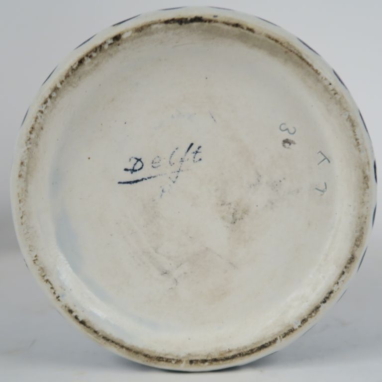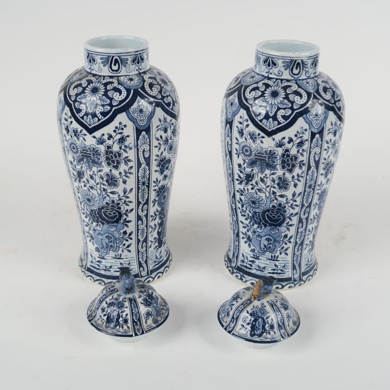Paire de vases couverts en faïence de Delft à décor en camaïeu de bleu de fleurs dans des réserves. H. 33 cm. (Petits accidents)