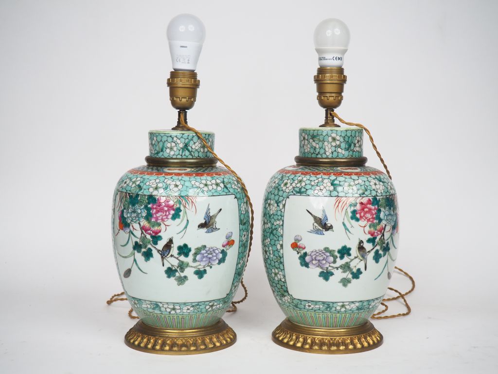 Paire de vases couverts en porcelaine polychrome de Chine décor famille verte montés en lampe décor de fleurs et d'oiseaux dans des réserves.