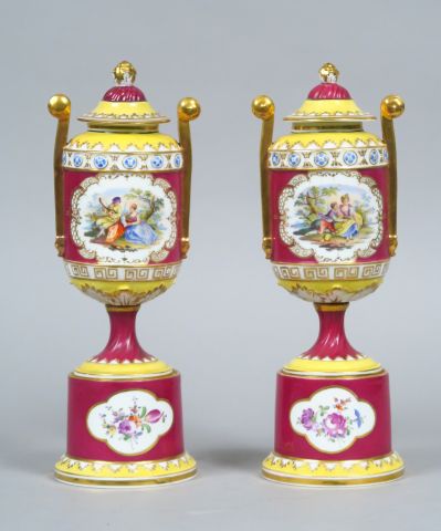 Paire de vases couverts fin XIX ème en porcelaine de Vienne, sur socle cylindrique, à décor dans des réserves de scènes galantes et de fleurs, sur fond lie de vin, jaune jonquille rehaussé d'or. H. 28 cm