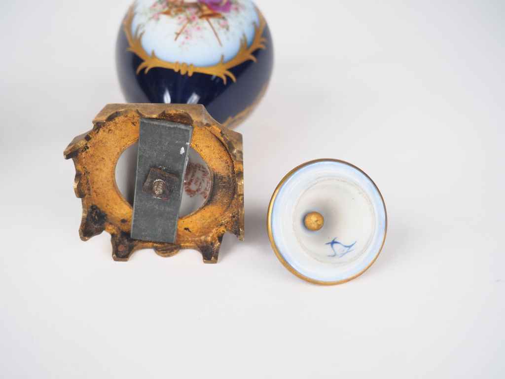 Paire de vases couverts Napoléon III en porcelaine de style Louis XVI à décor de portraits d'élégantes et de trophées dans des réserves sur fond bleu nuit et doré, monture en bronze. Signés. H. 15 cm.