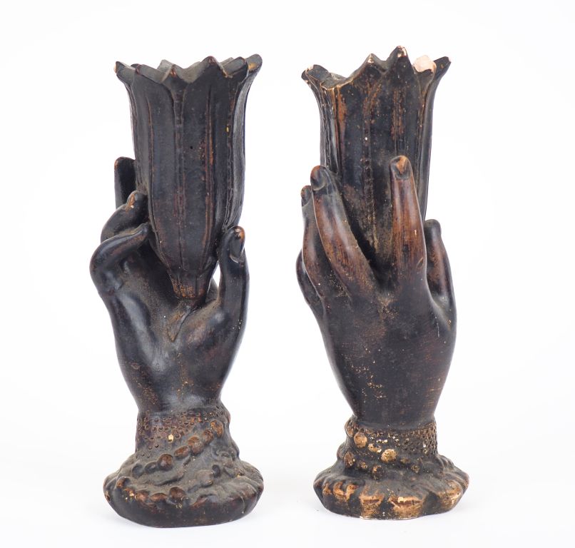 Paire de vases fin XIXème début XXème en plâtre patiné brun en forme de main présentant une fleur. H. 23 cm. (Egrenures).
