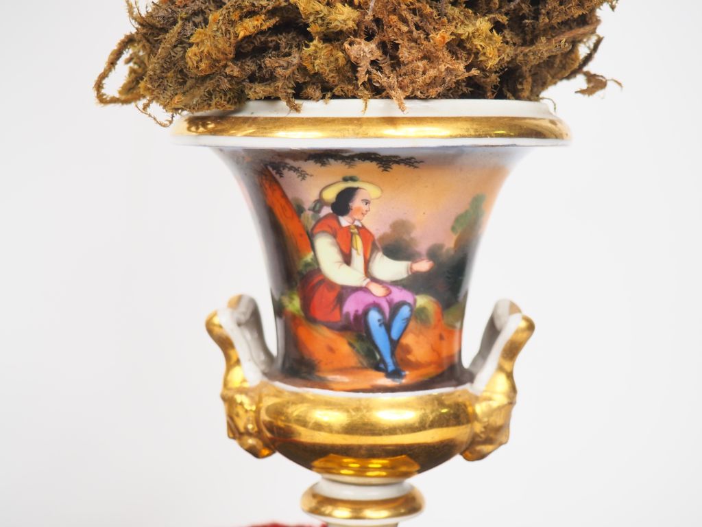 Paire de vases Médicis porte bouquet XIXème en porcelaine de Paris à décor de paysages animés. (Manque un globe) H. 17 cm. H. totale : 55 cm