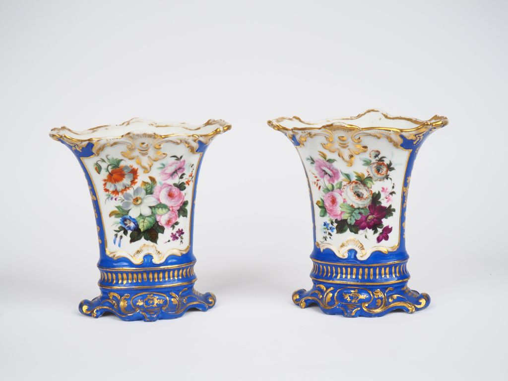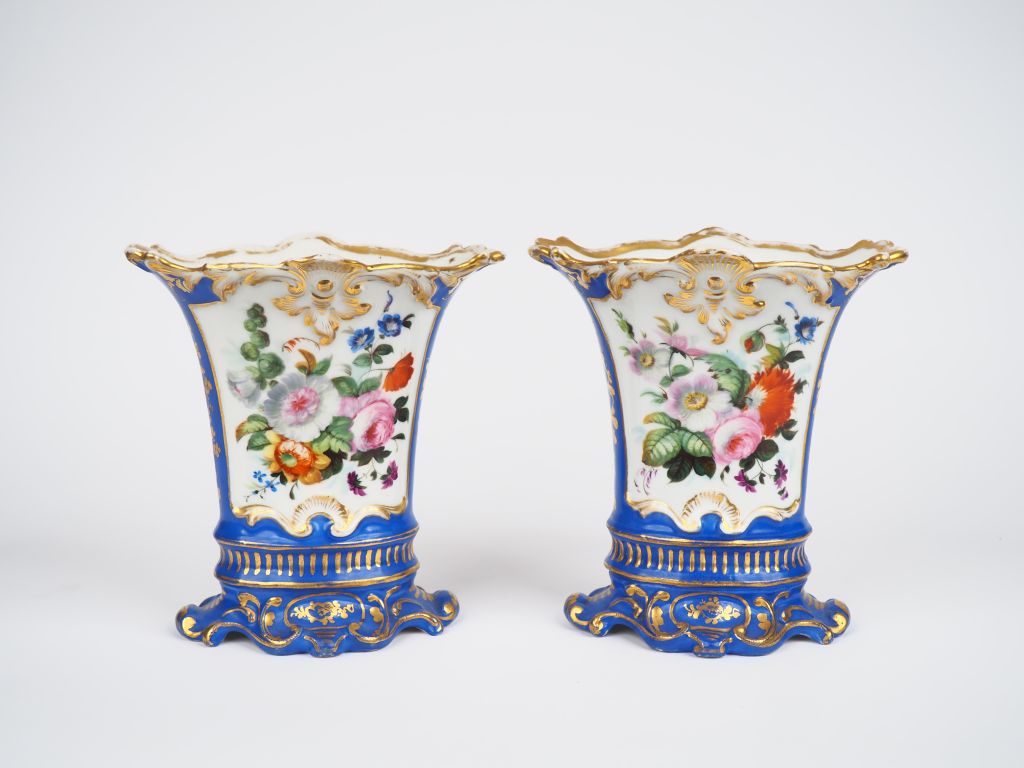 Paire de vases Napoléon III en porcelaine de Paris, à décor de fleurs polychromes dans des réserves sur fond bleu rehaussé d'or. H. 20 cm