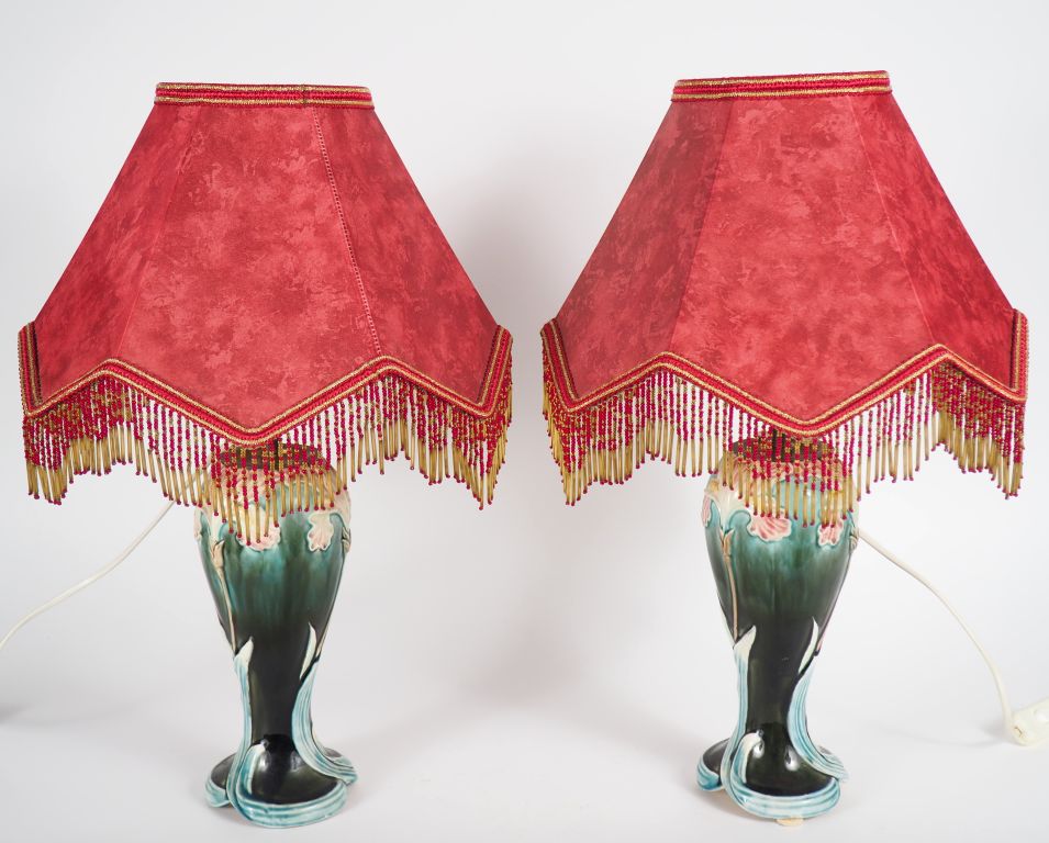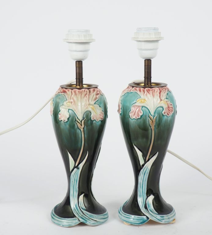 Paire de vases ovoïdes Art Nouveau en barbotine à décor polychrome d'iris, montés en lampe. H. 24,5 cm