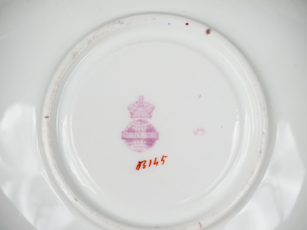 Partie de service à thé en céramique de Minton à décor de fleurettes et de croisillons bleus, comprenant : - une théière - 4 tasses et sous-tasses On y joint 2 tasses et sous tasses en Minton (autre modèle).