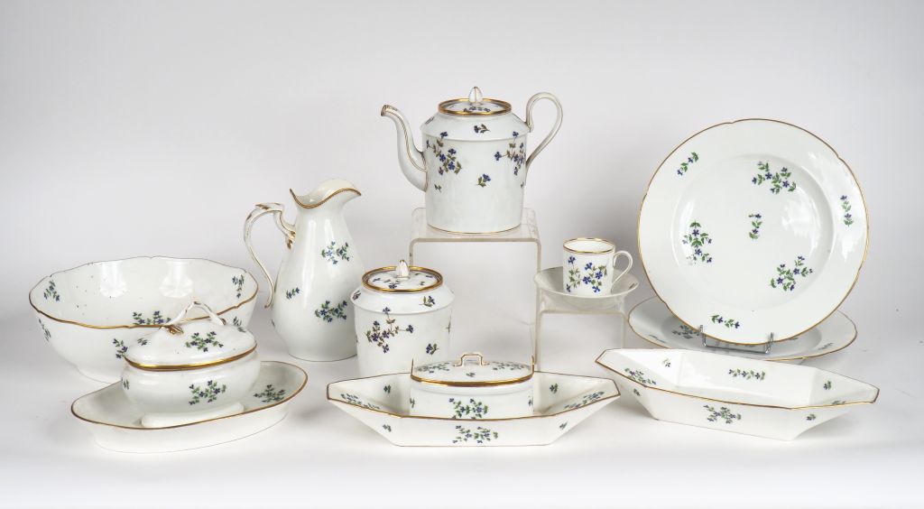 Partie de service de table en porcelaine, décor aux barbeaux comprenant : trois saucières, deux ramequins, deux différentes coupes sur talon, un pichet, une theière, un sucrier, 14 tasses et sous tasses (six pièces signées de la Manufacture du Duc d'Angoulème)