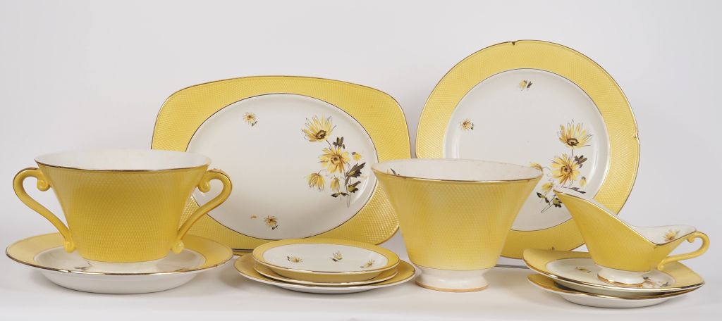 Partie de service en porcelaine de Salens à décor de marguerites et de croisillons jaunes sur fond blanc.