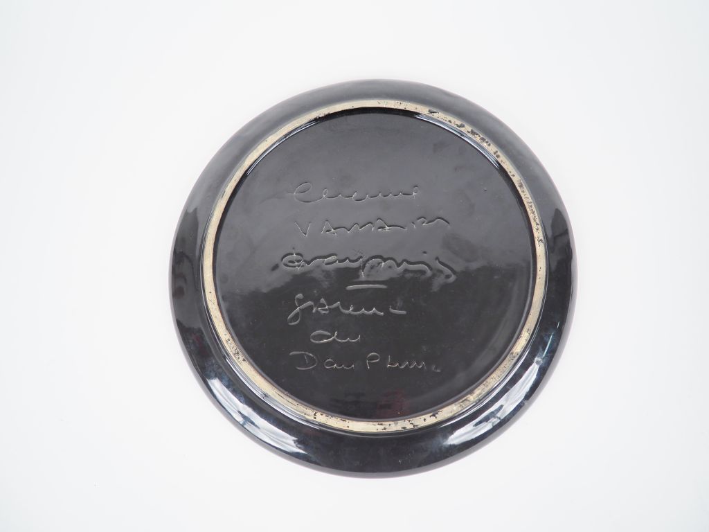 Plat 1960 en céramique polychrome à décor de jeune femme agenouillée. Signé au dos. Diam. 30 cm