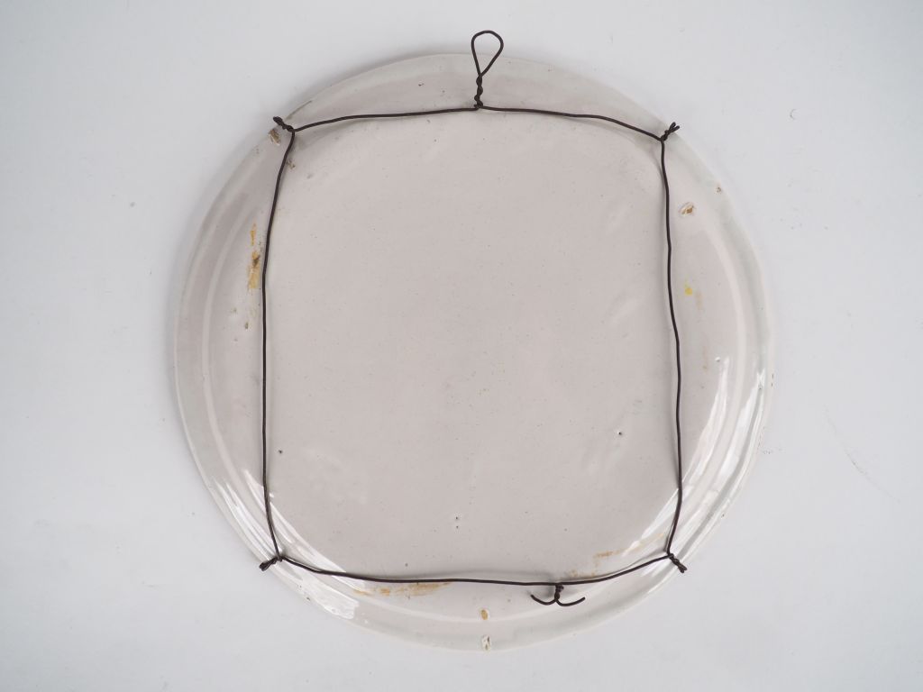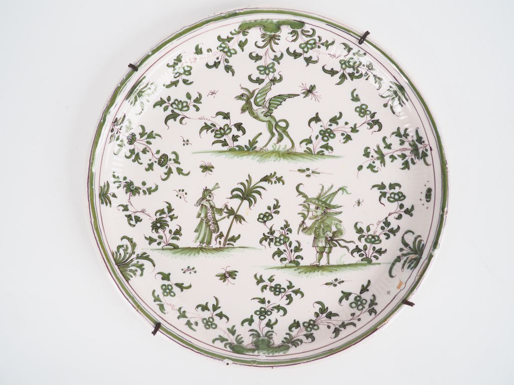 Plat rond en faïence de Moustiers XVIIIème décor en camaïeu vert de trois grotesques. Diam. 31,5 cm.