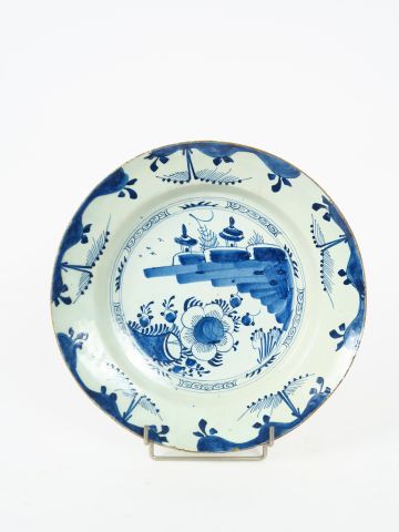 Plat XVIIIème en faience de Delft, à décor en camaïeu bleu sur fond blanc (quelques sauts). Diam. 34 cm