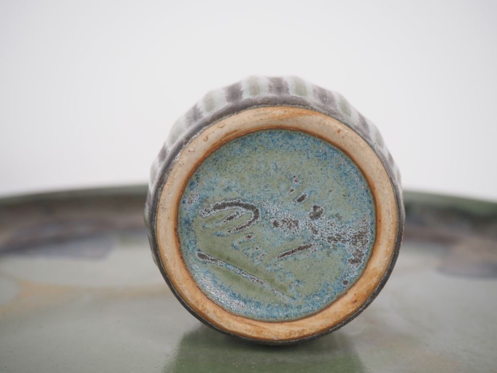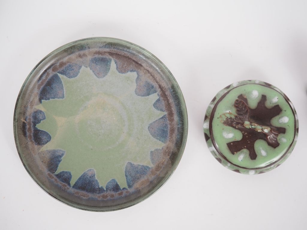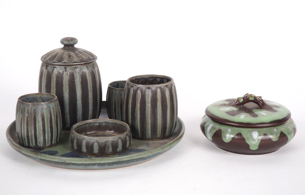 Plateau et 5 récipients en grès vert et brun , une bonbonnière en grès...